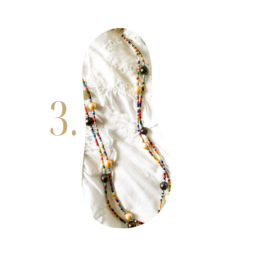 Nathalie Assou's designs are inspired by her travels african roots, and love for all things colorful, sparkling and beautiful. The Novica Necklace is 28" long, combines African Glass Beads with Baroque Pearls, and is finished with Gold Filled Beads and a Sailor Clasp.