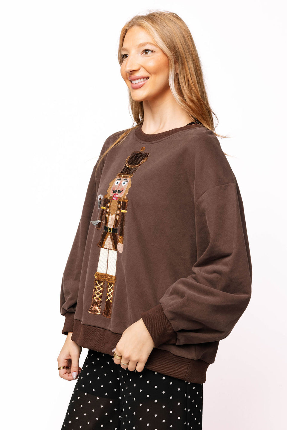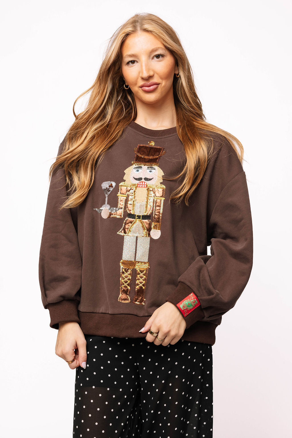 Cozy up this holiday season with this playful brown sweatshirt featuring a festive nutcracker serving an espresso martini. Its slightly oversized fit makes it perfect for relaxed comfort while celebrating your favorite holiday cocktail in style. A fun and festive way to enjoy the season’s spirit!